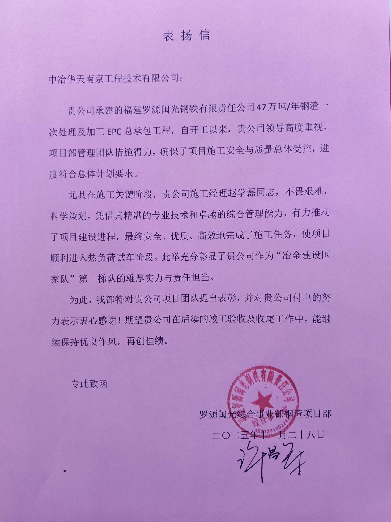 近日,中冶華天承建福建羅源閩光鋼鐵有限責(zé)任公司47萬噸/年鋼渣一次處理及加工EPC總承包項(xiàng)目收到業(yè)主發(fā)來的表揚(yáng)信,對中冶華天一直以來給予該項(xiàng)目的高度重視和大力支持表示感謝,對項(xiàng)目團(tuán)隊(duì)專業(yè)技術(shù)能力和優(yōu)質(zhì)服務(wù)品質(zhì)表示贊揚(yáng),進(jìn)一步鞏固了中冶華天與福建羅源閩光的友好合作關(guān)系,也彰顯了中冶華天作為“冶金建設(shè)國家隊(duì)”第一梯隊(duì)的雄厚實(shí)力與責(zé)任擔(dān)當(dāng)。