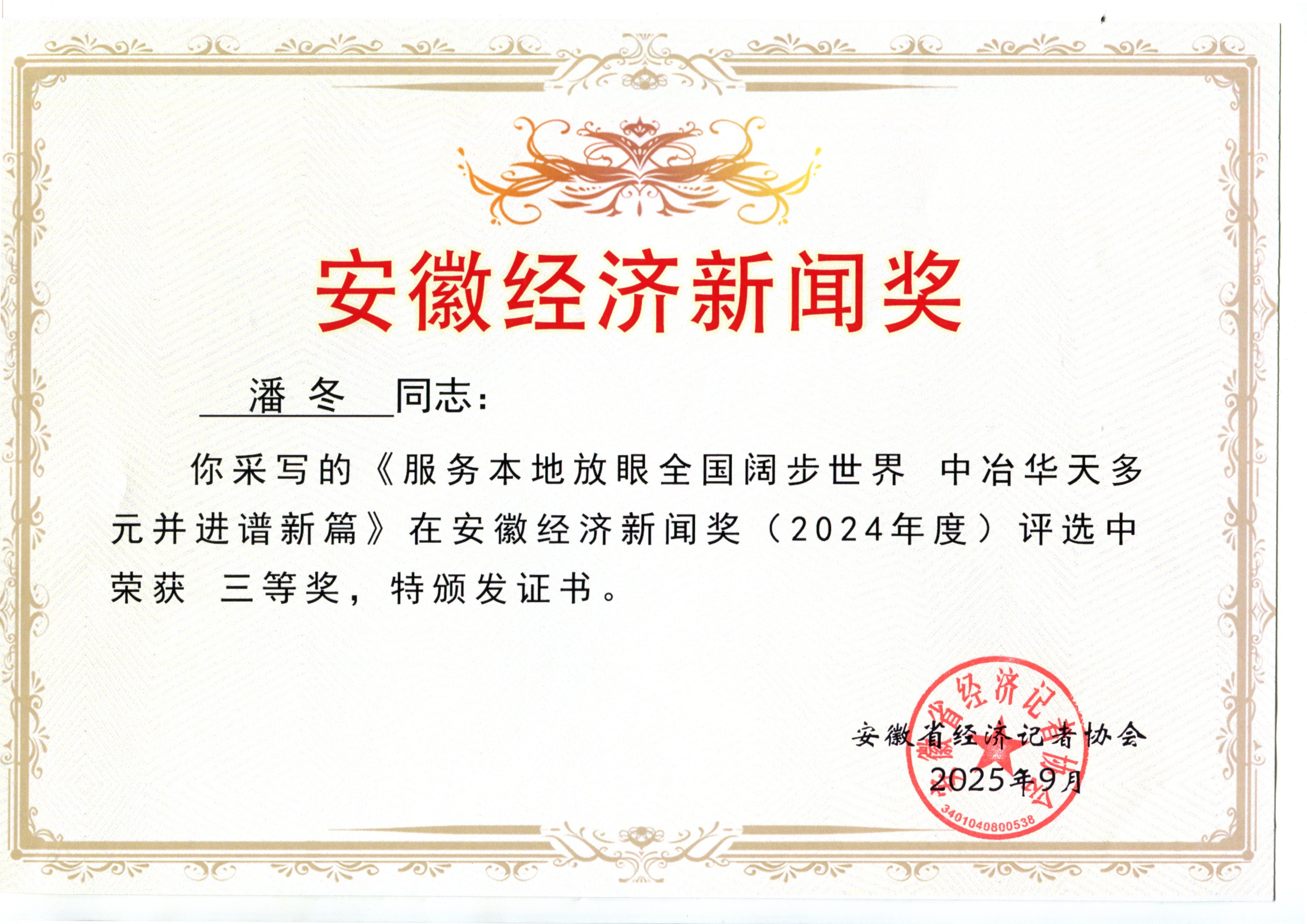 近日,中冶華天收到安徽省經(jīng)濟記者協(xié)會頒發(fā)的獲獎證書,由公司黨群工作部(黨委宣傳部)員工潘冬采寫的新聞稿件《服務(wù)本地放眼全國闊步世界 中冶華天多元并進譜新篇》獲評安徽經(jīng)濟新聞獎三等獎,有力彰顯了公司推動再轉(zhuǎn)型再升級的最新成績和用心策劃宣傳的積極作為,是對其高質(zhì)量發(fā)展實踐與品牌傳播成效的雙重肯定。