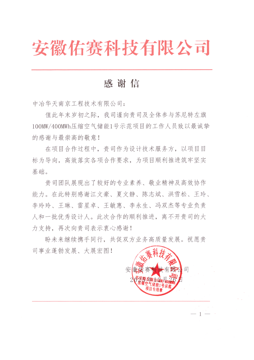 近日,中冶華天收到來自蘇尼特左旗100MW/400MWh壓縮空氣儲能1#示范項(xiàng)目合作方安徽佑賽科技有限公司(簡稱“佑賽科技”)的感謝信,信中對中冶華天在項(xiàng)目合作過程中展現(xiàn)出的專業(yè)能力和敬業(yè)精神給予高度評價(jià),對設(shè)計(jì)團(tuán)隊(duì)成員表示衷心感謝,集中展現(xiàn)了公司踐行的高品質(zhì)履約精神與華天人的向陽風(fēng)貌。